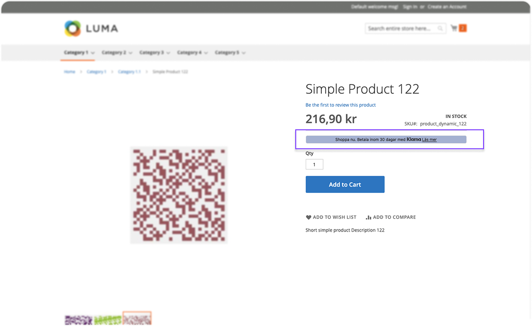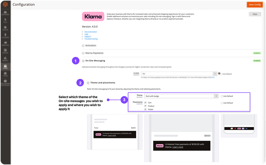 You can configure the position and design of the placements in the Admin panel with this path: Stores > Configuration > Sales > Payment Methods > Klarna > On-site Messaging