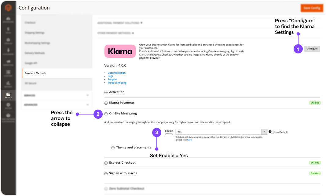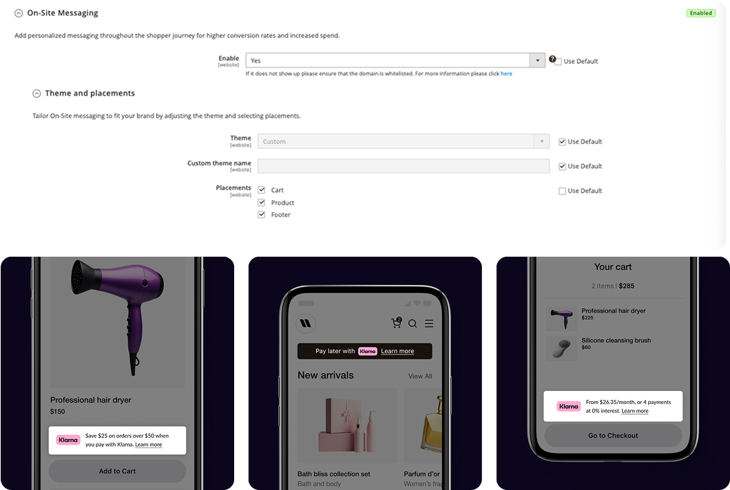 1. In the Adobe Commerce Admin, expand the Klarna On-Site Messaging section and set Enable to Yes.