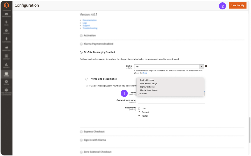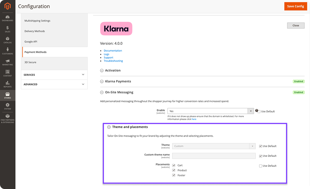 5. To make the placement visible in your Adobe Commerce store, go to the configuration settings for On-site Messaging under Theme and placements, set Theme to Custom, and click Save Config in the top right corner.