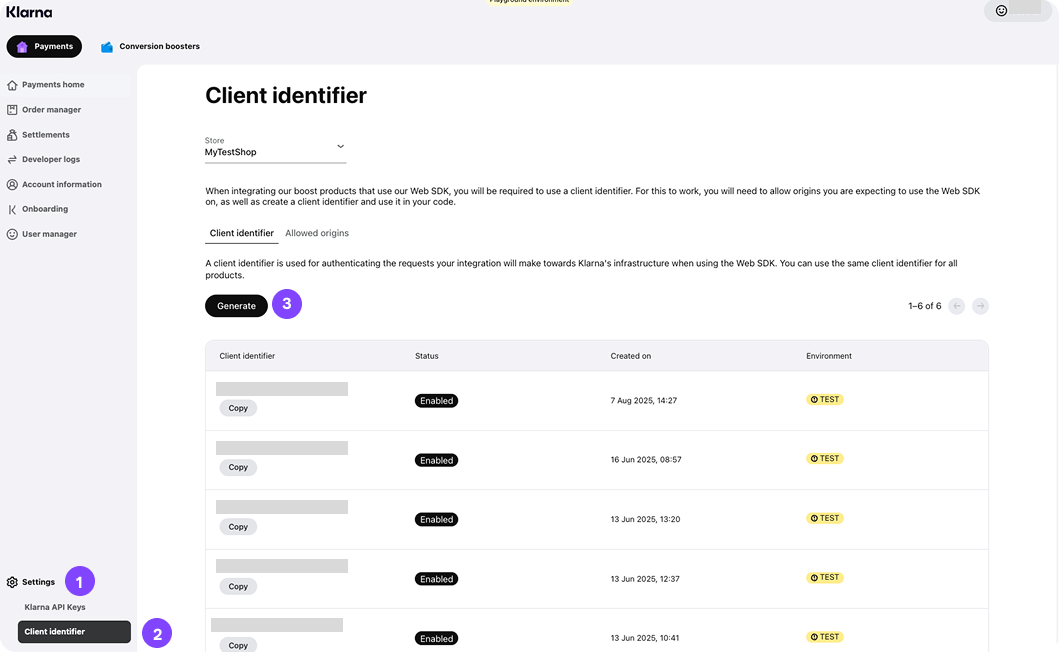 2a. In the Klarna merchant portal, navigate to Settings > Client identifier > Generate. Copy and save the Client Identifier.
