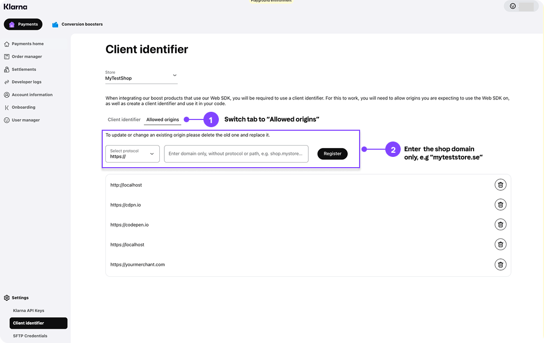 2b. In the very same page, switch the tab from "Client Identifier" to "Allow origins". Enter the store domain only (exclude https://) and press "Register"