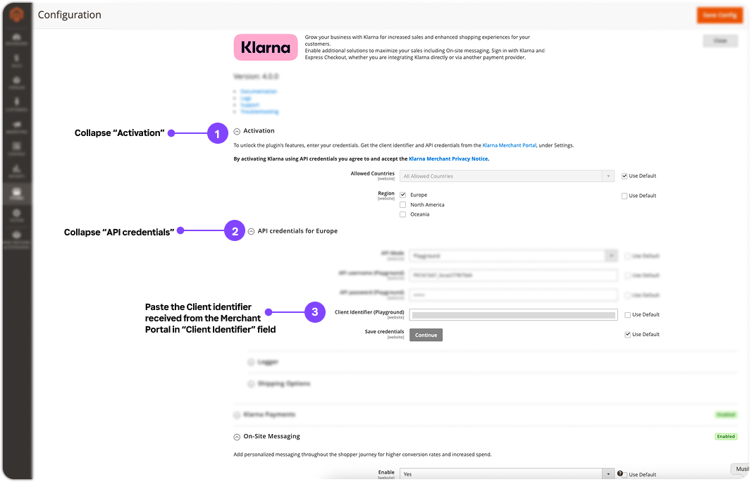 3. Back in Adobe Commerce Admin in the Activation section, collapse "API credentials" and enter the client identifier value that was being retrieved from the Klarna merchant portal in step 2a.