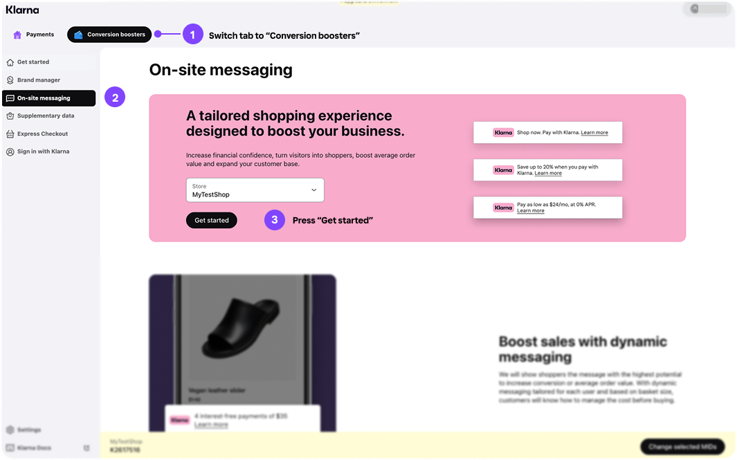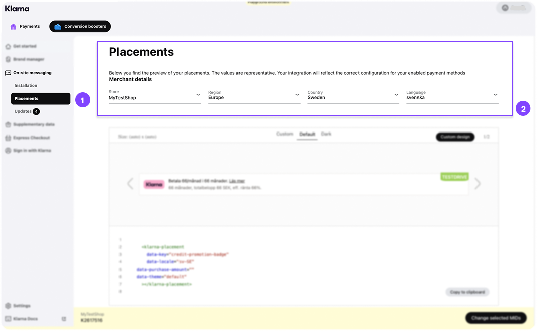 2. After clicking Get started, a new option called Placement will appear under On-site Messaging in the left-hand menu. Go to Placement and fill in the requested merchant details at the top of the page.