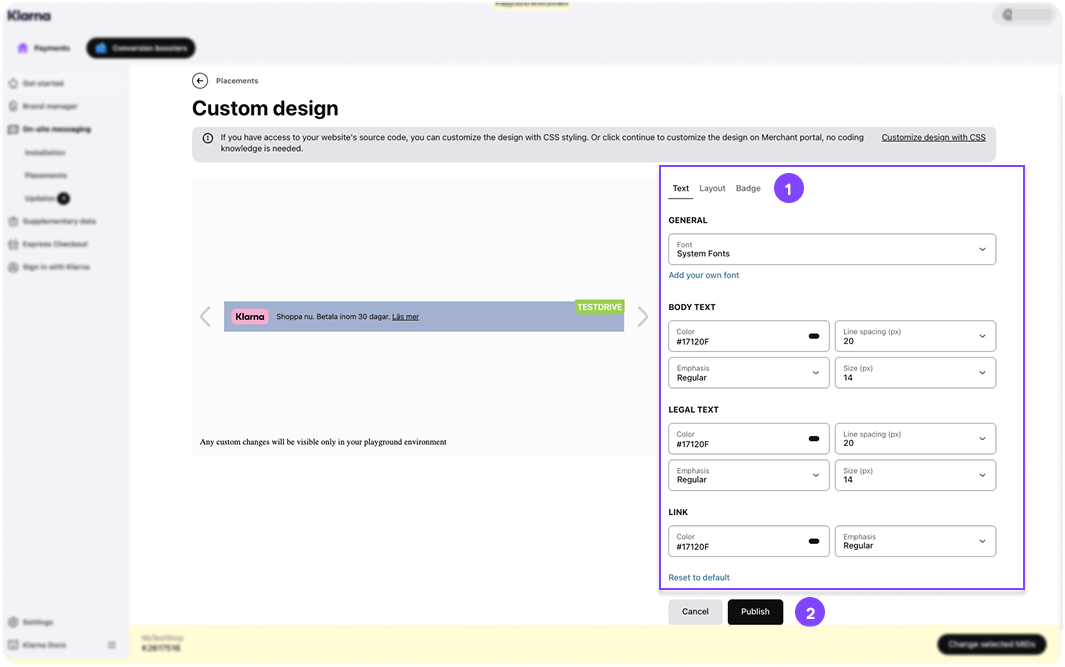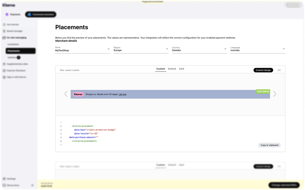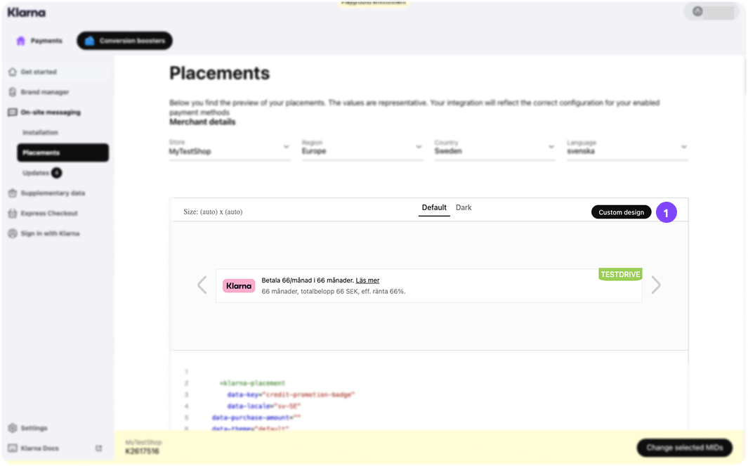 The design is predefined on Klarna’s side and the information about it is returned through the API. No manual work is needed except choosing the design.