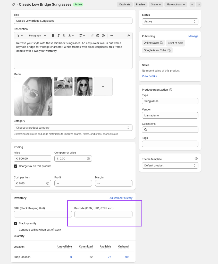 Where to find the barcode field in product settings.