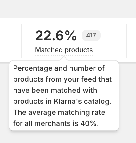 Once you are up and running, you will be able to see statistics on your products in the Klarna app and web. If you are seeing a low amount of matched products, you can reach out to our support for more information on this. If you have around 30-50% matched products, this you are around Klarna average. If you have over 50% matched products, you are above Klarna average.